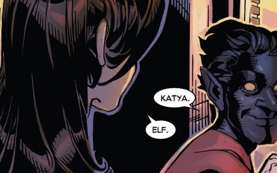 Waitaminute. Hold up. I was too busy having feels to realize that “KATYA” is Colossus’s Russian nickname for Kitty. Nightcrawler always called her “KATZCHEN” which is German for kitten. Was this scene originally supposed to have Piotr and Kitty having a nice moment, since he just recently returned to the X-Mansion, and Kitty and Kurt have had their reunion moment already, brianmichaelbendis?