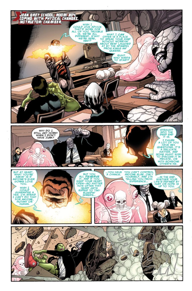 I mean, if they’re gonna have a non-mutant professor teach that class shouldn’t it be, like, Deadpool or something? I realize he’s a bit…unstable but he likes kids and he certainly can’t blend in with the ‘normals’. Also, if they let Fantomex teach (you know, the guy who shot a child point-blank in the head?) surely Deadpool can be on the staff.