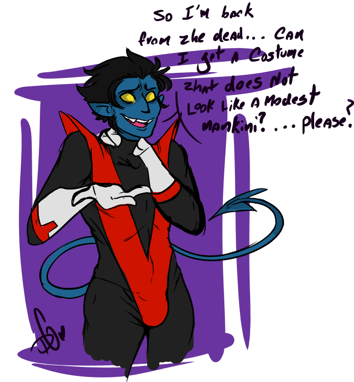 Ah, yes. The V to the goodies costume. Still better than some he had in the 90’s but he and Kitty Pryde could both use a makeover. I second the vote for Kris Anka!