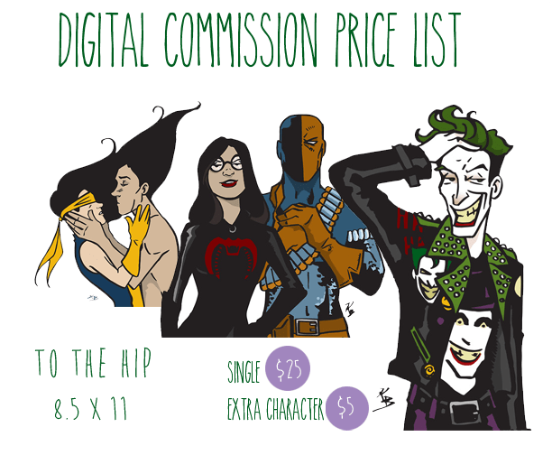 Here’s a list of my basic commission prices for interested parties. This particular listing is for digital commissions. You get a high resolution file that you can take to the print shop of your choice.
