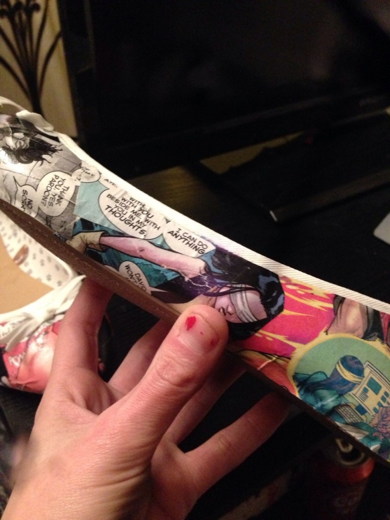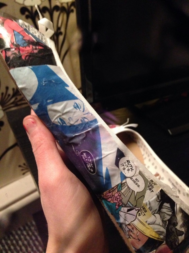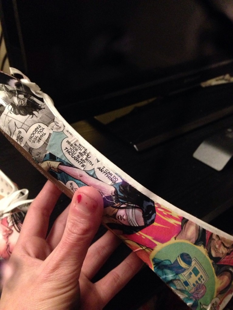 So these aren’t completely finished (I need to trim the edges, add a few more coats of modpodge and smooth the bubbles out) but look! I made myself some X-Men Legacy shoes ❤ I couldn’t bare to cut up issues 23-24 because while I managed to find copies of the other issues, my local comic store didn’t have any spares in stock 😦 So no dream dancing shoes sigh. But I’m happy with them :)!