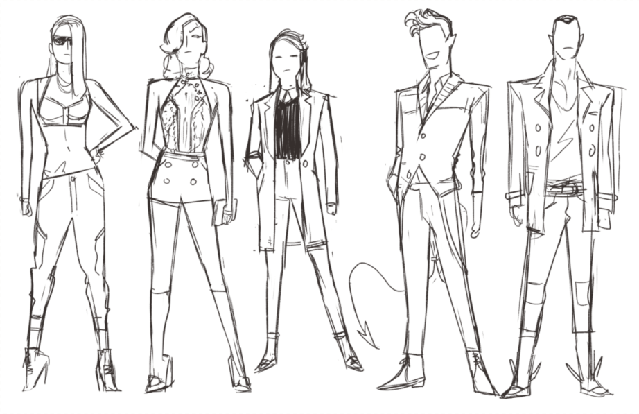 we wanted to do like a night-out fashion x-men piece. here are my designs for betsy, emma, hisako, kurt, and namor.