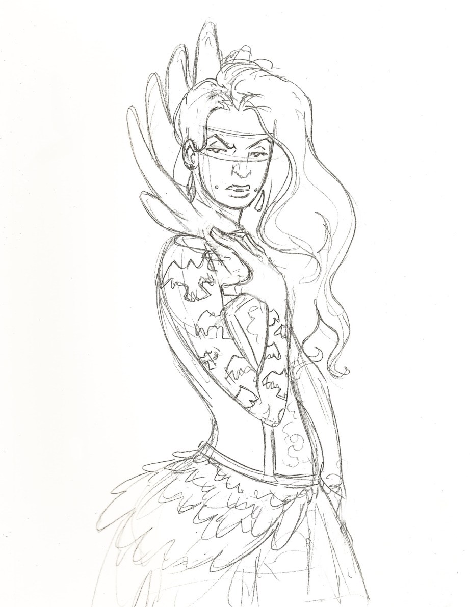 So, I was looking at my first drawing of The Morrigan and, while I like it, I felt like it didn’t quite match the other 3 WicDiv characters I’d sketched. Here’s v. 2.0.