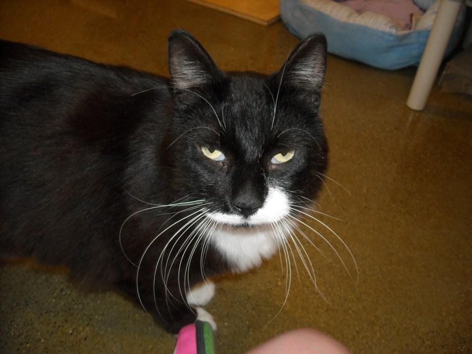 This cat is the manliest cat , huge, cuddly, but with the squeak like a mouse. He will stand down a dog, follow you everywhere , and basically be your best friend. Look at that mustache.