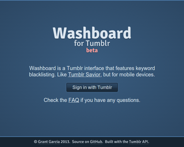 That’s where Washboard steps in: just sign in with Tumblr, import your blacklist from Tumblr Savior, and start browsing! Washboard also features infinite scrolling, a “Safe Mode" toggle that hides images, and a few other features that make mobile browsing as painless as possible.