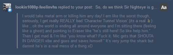They are really dragging on the Eraser thing. I was hoping to see him this week but, nope. So I’m just pretending everything is fine. Someone will notice he’s missing eventually, right? Maybe Fatgum and Kirishima? They’re still…somewhere right? I’m beginning to lose track of what’s going on in all this chaos.