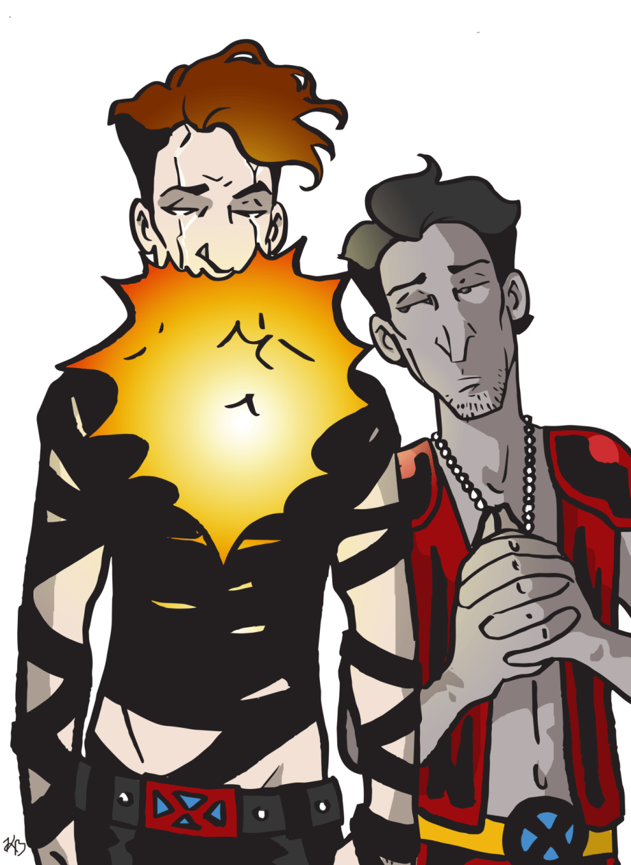 Jono and Angelo standing around looking angsty. Someone needs to help Jonothon with his costume malfunction.