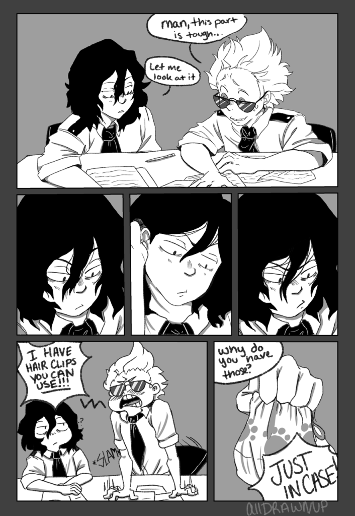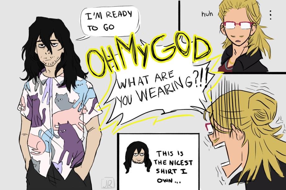 @glitzbot found this picture on Pinterest while looking up reference and it was the ugliest cat shirt I’ve ever seen. And immediately we just knew Aizawa would own this ugly cat shirt.