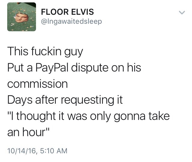 ARTISTS. PLEASE USE PAYPAL INVOICES. it will SAVE you. And to: the people who do this to artists – Fuck you. It’s okay if you change your mind and want a refund. But freaking TALK to us and let us know what’s going on. Let us WORK with you.