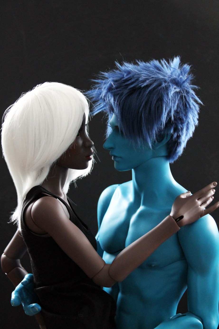 Nightcrawler is a Dollshe Grant Phillippe that I modded to look like our favorite fuzzy blue elf. Storm is a Twigling Newkiru and she just came that gorgeous.