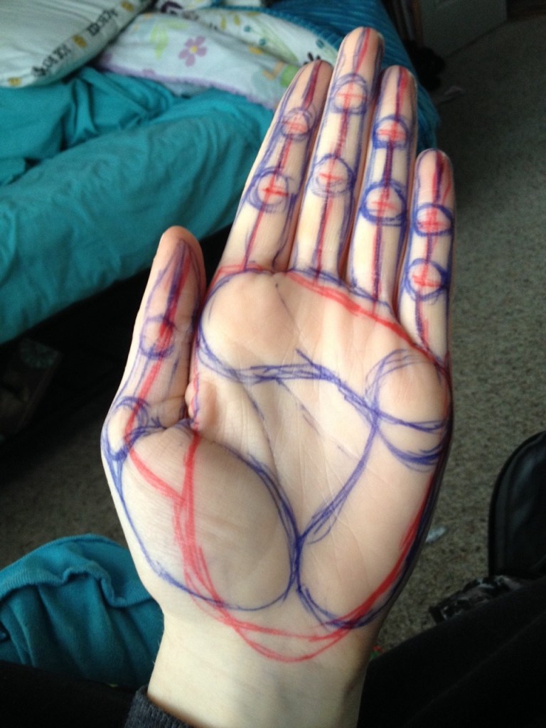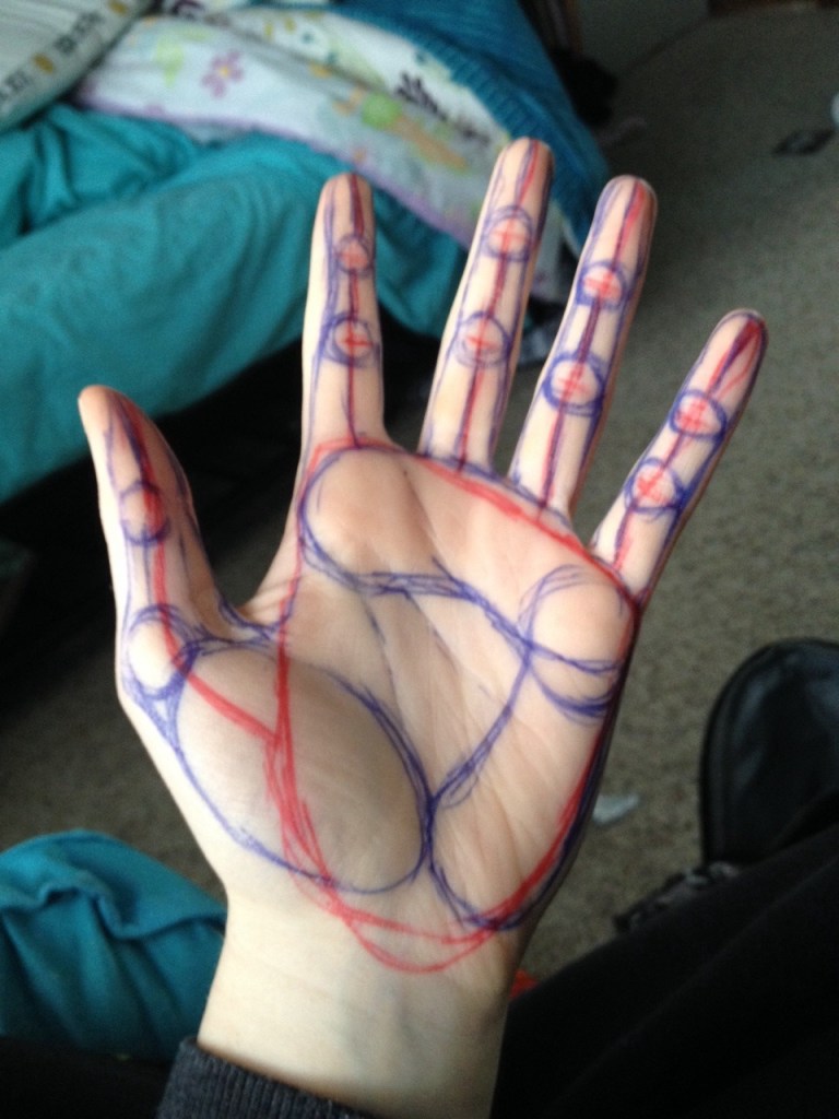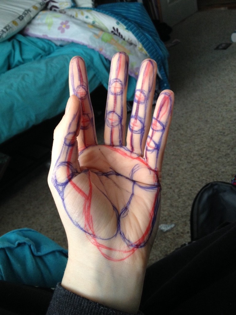 I always struggled drawing hands before anyone told me what to do. So here is a HANDy dandy drawing reference to see the steps on an actual hand. There are three big muscles in the palm. The thumb lump is most important because without it you’ll never even get the shape right. Circle up the knuckles and draw bendy lines (red) to connect them. Make sure the fingers go from medium-tall-short-shortest just slightly (index=>pinky finger). Notice the big red squareish shape around the palm-that’s the first thing I do. Note: every infer has 2 knuckles don’t forget the thumb does too…just in a weird way.