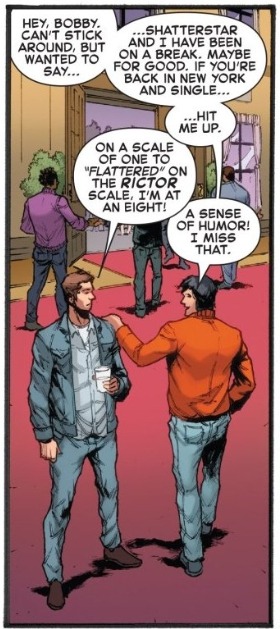 I… didn’t see that coming and I’m not sure how I feel about it. On the one hand, it’s not like all queer characters should be paired up for life; we’ve got committed couples like Wiccan/Hulkling and Northstar/Kyle with which to explore the long-time partner dynamic, so let’s let others have some dating hijinks. On the other, I feel like the dynamic between Rictor and Shatterstar really hadn’t been explored all that deeply yet due to Marvel having a tendency to make their queer couples much less of a priority once they’ve gotten their GLAAD nomination out of the way. It feels like a hell of a cheat to go from “hey, we’re good and in love and working on things” to “this may be a done thing” without letting the readers see the emotional beats in between.