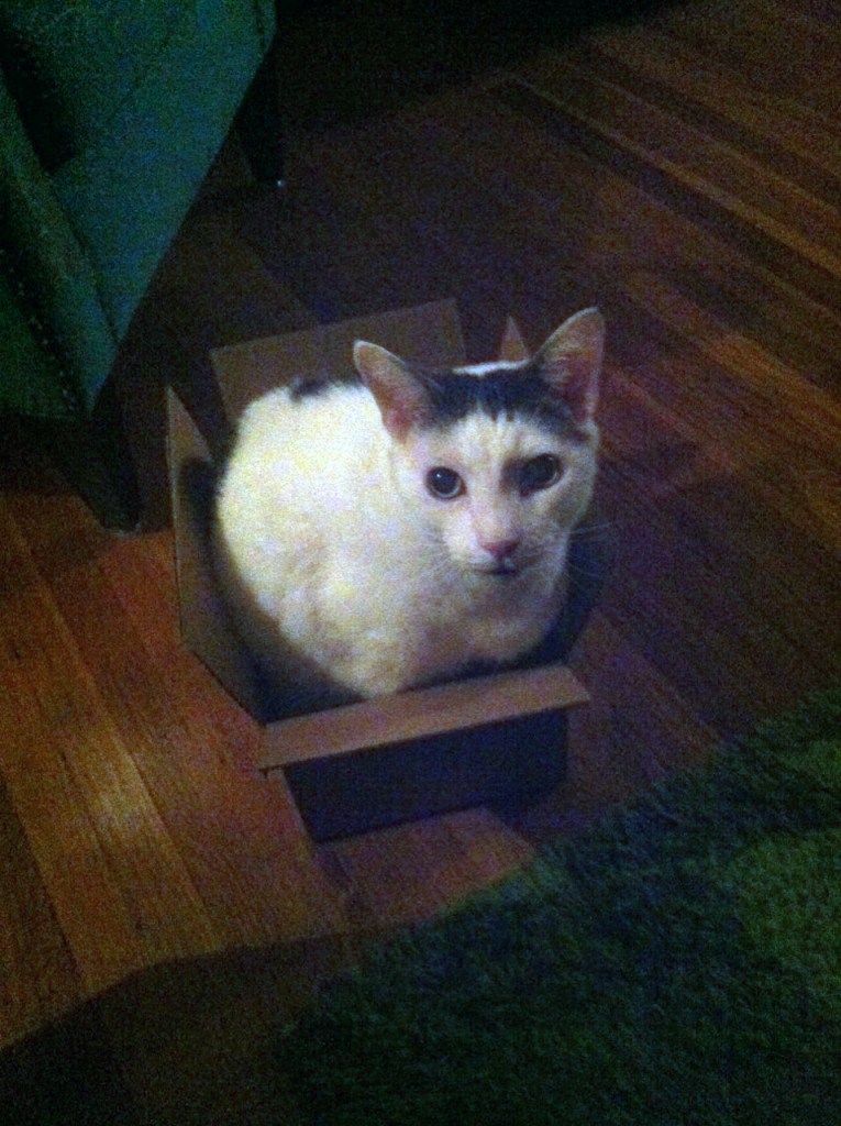 I got a small box today filled with baby clothes for a friend. Radar is trying really hard to make this box work for him.
