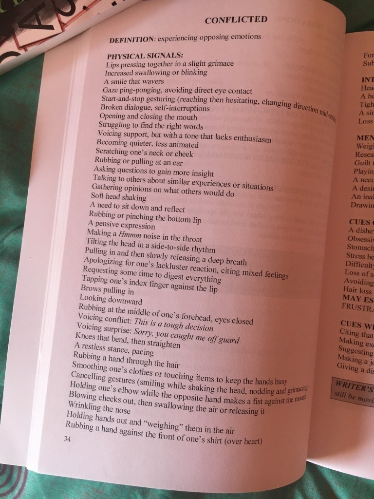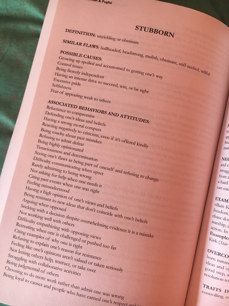 Negative Trait Thesaurus & Positive Trait Thesaurus -gives you a definition of said negative trait -gives you similar flaws also found in the book -gives you possible causes of WHY the character might have this trait -gives you a list of other behaviors the chara might have -gives you examples of the chara’s thought process -gives associated emotions -gives positive aspects of the trait, as well as negative -gives examples of well known chara’s that have this trait -talks about how the chara might overcome it -gives traits that, when combined with this one, might cause conflict How I use this information: Chara building, or when I get stuck on what I want a character to do. Man, I just can’t decide what they WOULD do. Well, awesome, I have a little guide to help me think through the character’s possible motivations. Also, I get help building a potential backstory because I get a framework of which to think, why is the character this way?