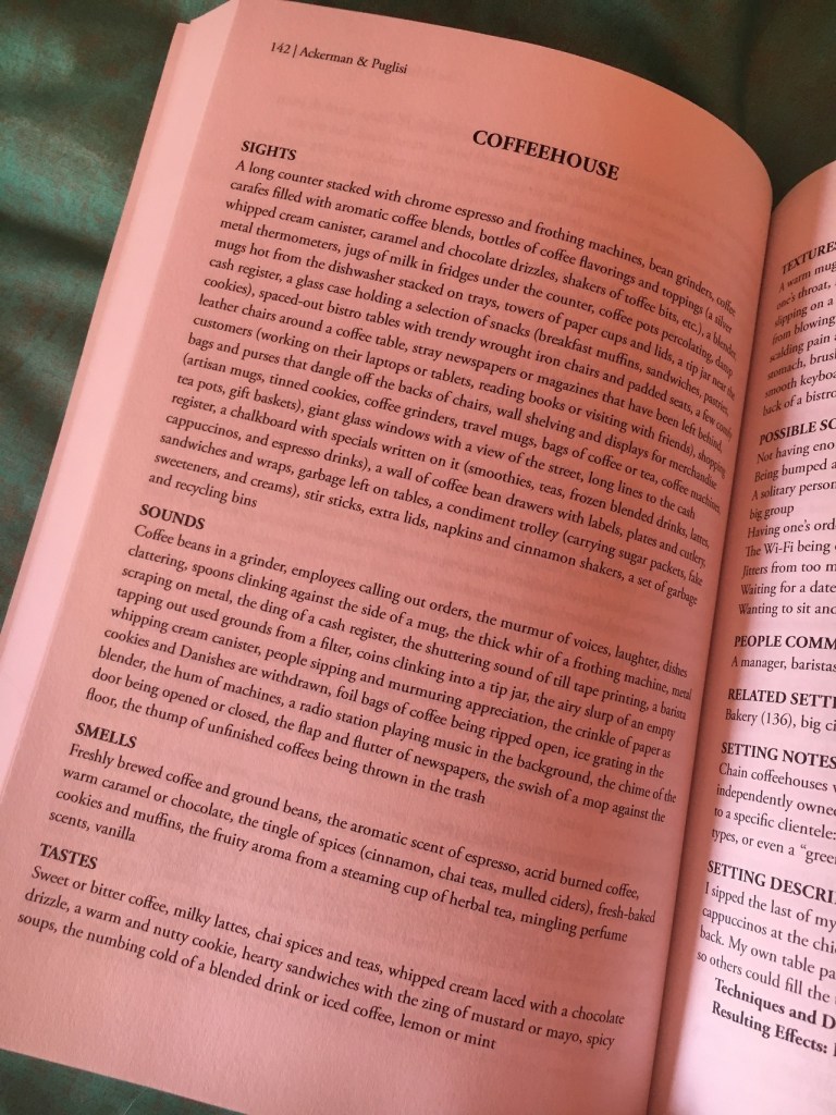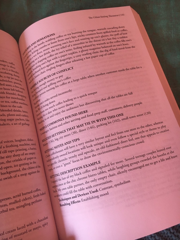 Urban Setting Thesaurus & Rural Setting Thesaurus -gives a whole lot of examples of sights, smells, tastes, and sounds -gives examples of textures and sensations (ie at an ‘antique shop’ you may encounter chipped paint, distressed wood, etc) -gives you possible sources of conflict (ie at a ‘hotel’ you might have noisy neighbors) -gives list of people you might expect to find at said location -gives related settings -gives tips on this type of setting -gives a setting description example How I use this information: IMAGERY IMAGERY IMAGERY