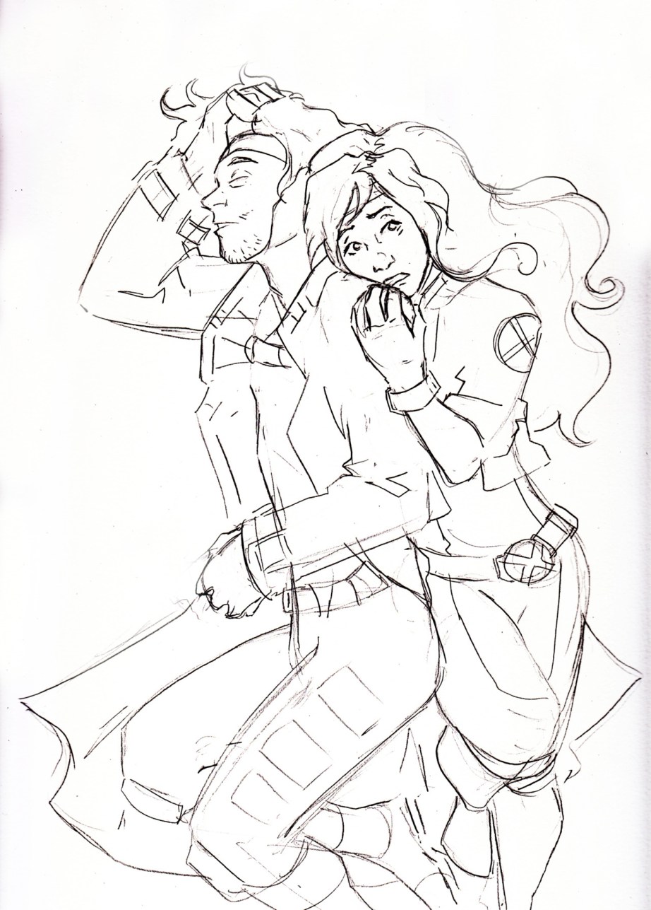 @theunhelpfultypeofocd said: Gambit and Rogue, wearing her gloves and buried into the back of his coat? If that makes sense. (The proportions are far too normal for our clowns. 😦 )