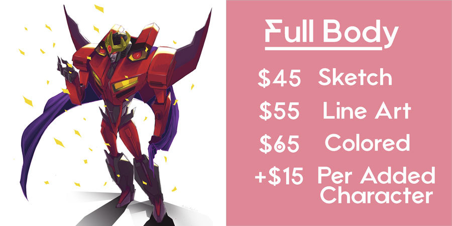 $35 line art+20 per extra character (up to 2) $55 simple shading+30 per extra character (up to 2) $85 full shading+50 per extra character (up to 2)