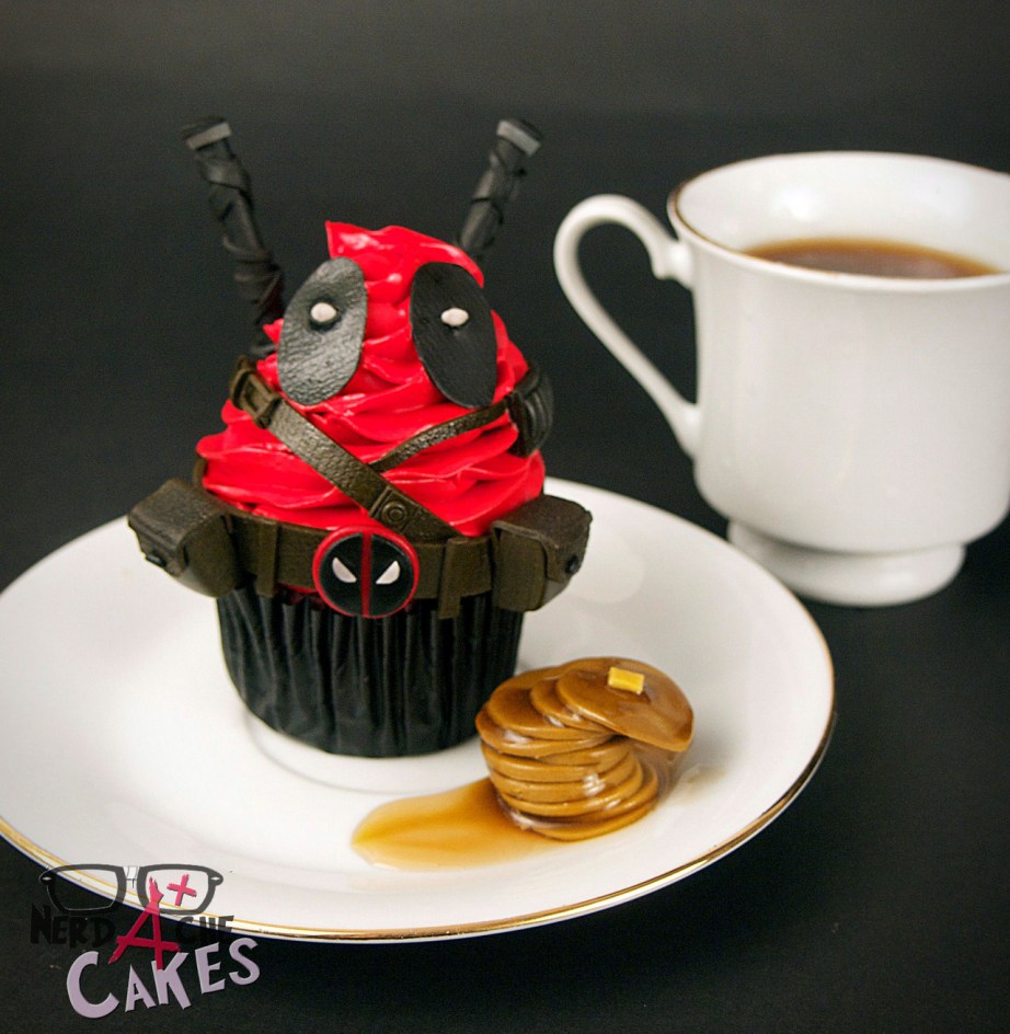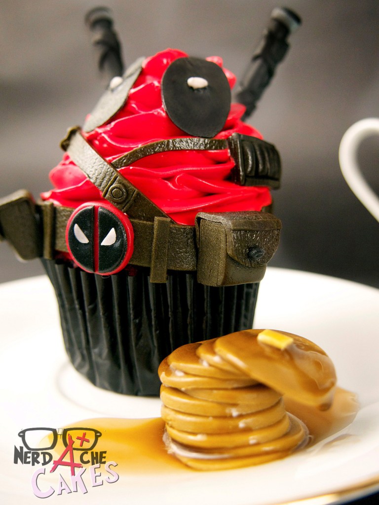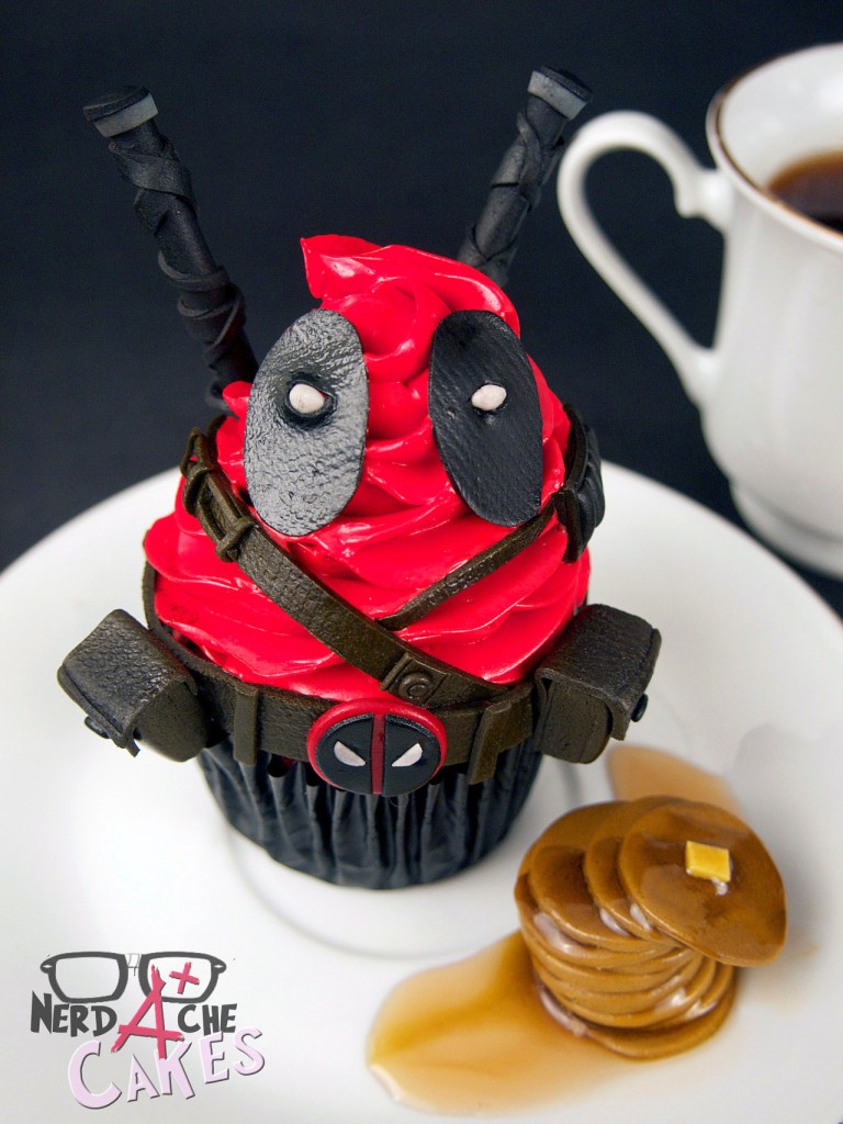 This Deadpool cupcake — complete with itty bitty pancakes — by nerdachecakes looks almost too good to eat.